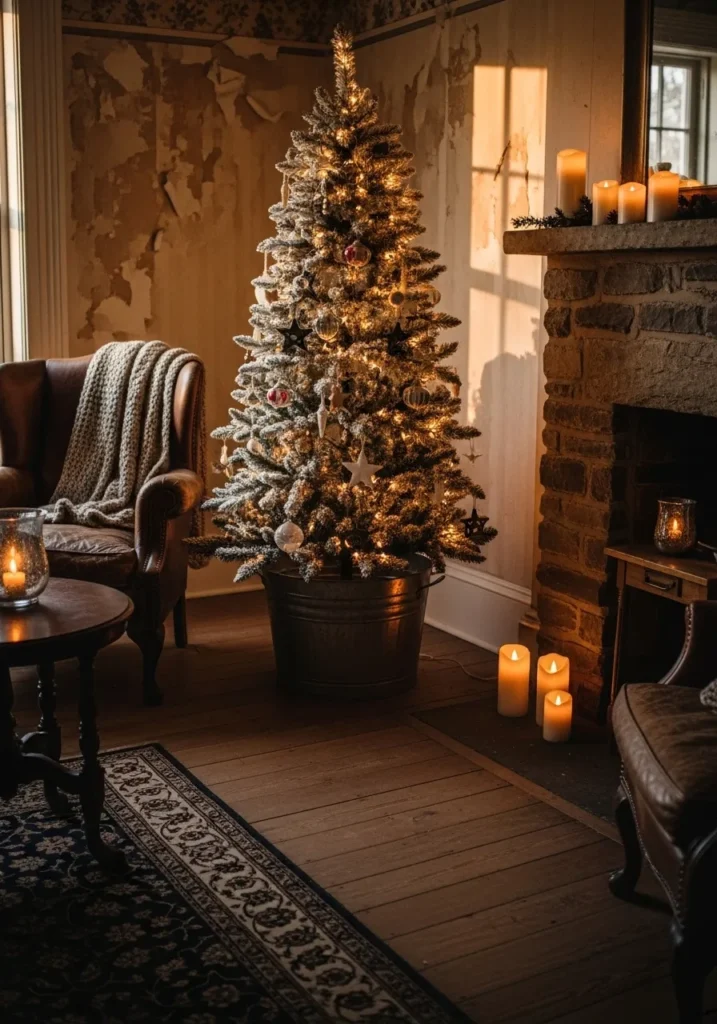 I adore this design because it celebrates imperfection in the most beautiful way. The peeling wallpaper, the worn wood, and the metal bucket tree stand all tell a story of comfort and character. It’s the kind of room that reminds me that Christmas isn’t about perfection—it’s about warmth, glow, and that feeling of being home, even when everything around you looks a little bit rustic and real.