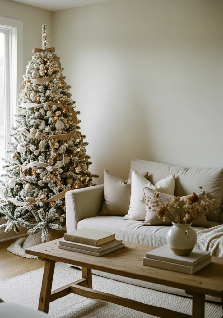 This design feels like stepping into a cozy winter morning where everything is calm, soft, and perfectly balanced. The flocked Christmas tree is beautifully dusted in white, wrapped with warm beige ribbons and simple neutral ornaments that glow gently under twinkle lights. A cream-toned sofa piled with plush pillows and a wooden coffee table with books and a ceramic vase make the space feel warm yet airy. Every detail whispers simplicity and serenity, creating the dreamiest Scandinavian-inspired holiday nook.