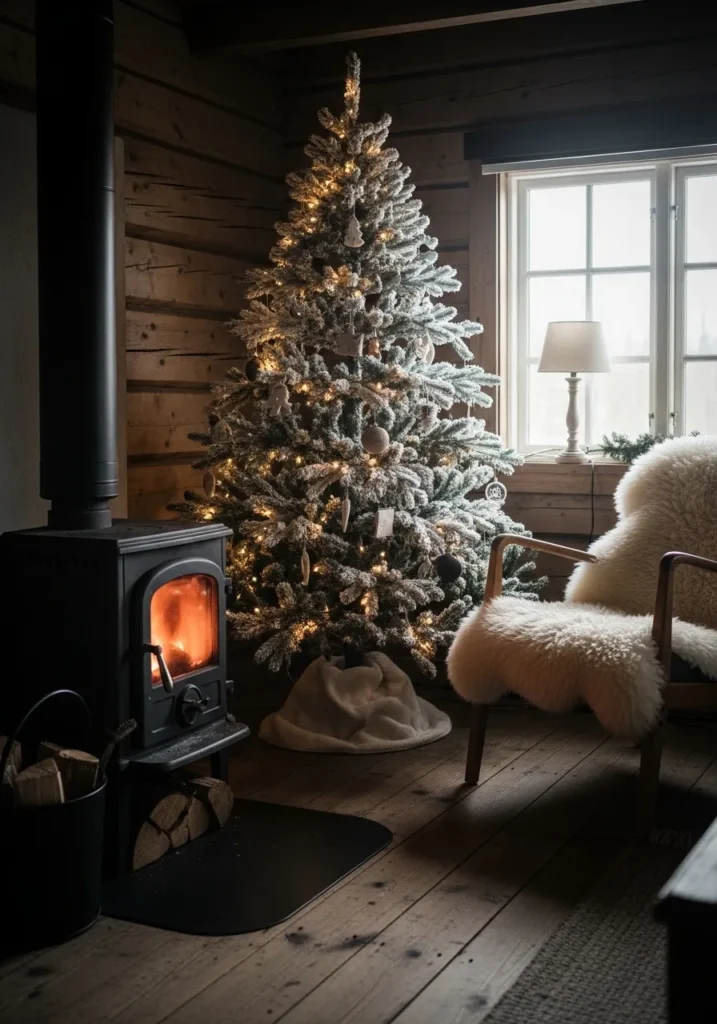 This cozy nook feels like a warm hug on a snowy day. The space is wrapped in honey-toned wood walls, rustic floors, and soft natural textures that make it impossible not to relax. A flocked Christmas tree sparkles softly beside a black wood-burning stove, its branches dusted like they’ve been kissed by freshly fallen snow. Gentle twinkle lights and simple neutral ornaments keep the look natural and timeless, while a plush shearling chair practically begs you to curl up with a cup of cocoa and a good book.