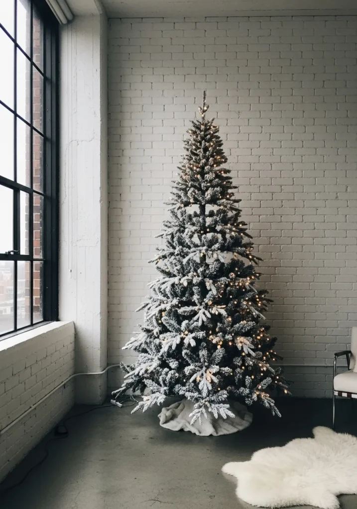 This minimalist loft embraces an industrial charm with its white brick walls, tall black-framed windows, and polished concrete floors. The flocked Christmas tree stands gracefully in the corner, its branches thick with snow-kissed texture and soft twinkling lights that glow against the muted space. A cozy white faux-fur rug and a simple chair add just enough warmth without cluttering the room, letting the tree remain the true centerpiece of calm sophistication.