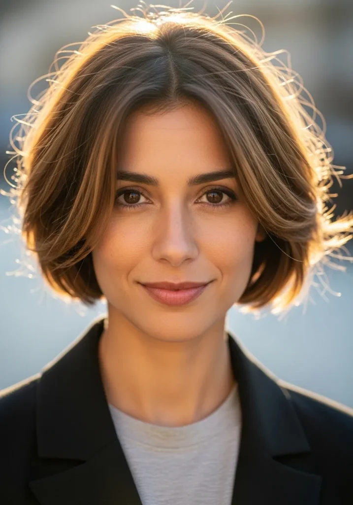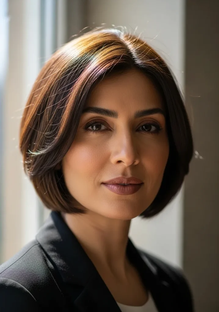 This sleek bob is cut with precision, offering a neat, professional style. The hair has a mix of dark and light brown tones, creating subtle highlights that bring depth to the hairstyle. The layers are softly stacked to provide volume without looking overly styled.