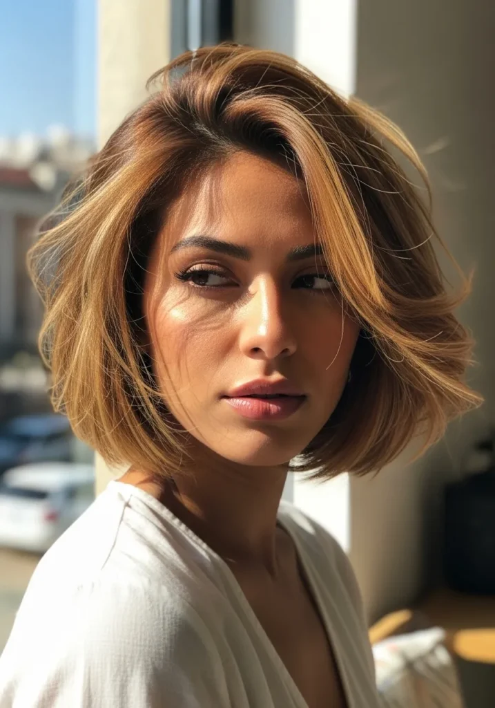 What makes this bob so great is its versatility. The sun-kissed color adds a fresh, beachy feel, while the layers give it an easy, natural bounce. It’s a perfect style for those who want a chic, everyday hairstyle with a little extra warmth.