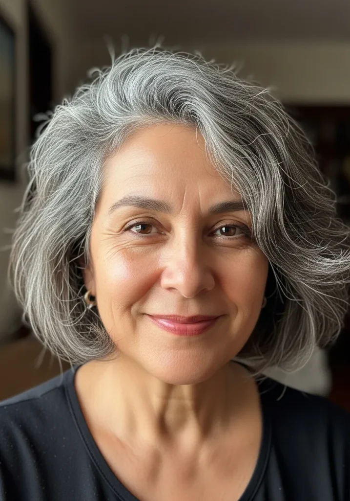 What I love about this hairstyle is how it enhances natural beauty while keeping things fresh and youthful. The layers give it a modern vibe, while the gray tones add a touch of sophistication. It’s the kind of style that flatters any face shape and works for all ages.