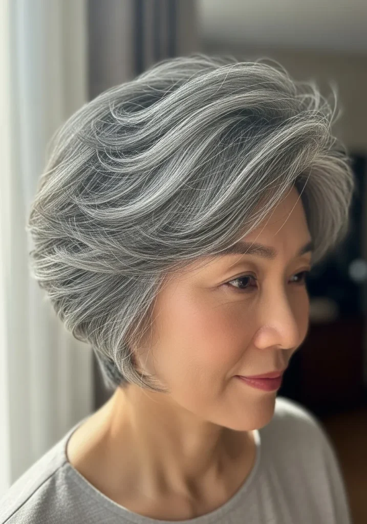 I love how this look feels so youthful and fresh while embracing natural grays. The volume adds a flattering lift, and the silver tones offer a chic, sophisticated finish. It’s the perfect option for anyone embracing their natural beauty in style.