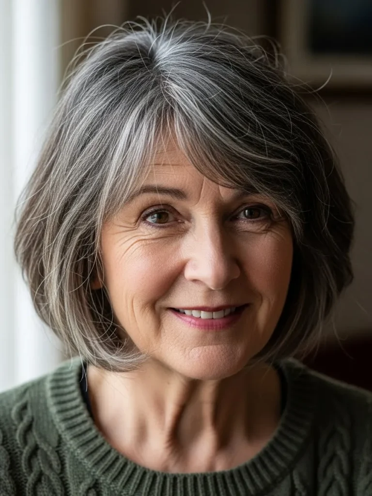 This softly layered bob has natural movement through the sides and gentle choppy texture at the ends. The gray tone is beautifully blended with lighter streaks that add dimension. The shape frames the face in a sweet rounded way and the length feels perfect for easy styling.