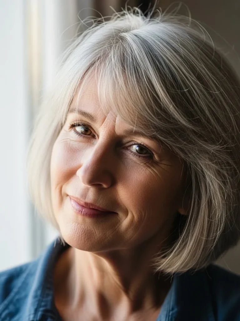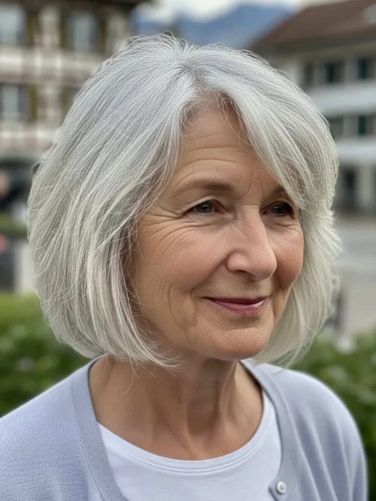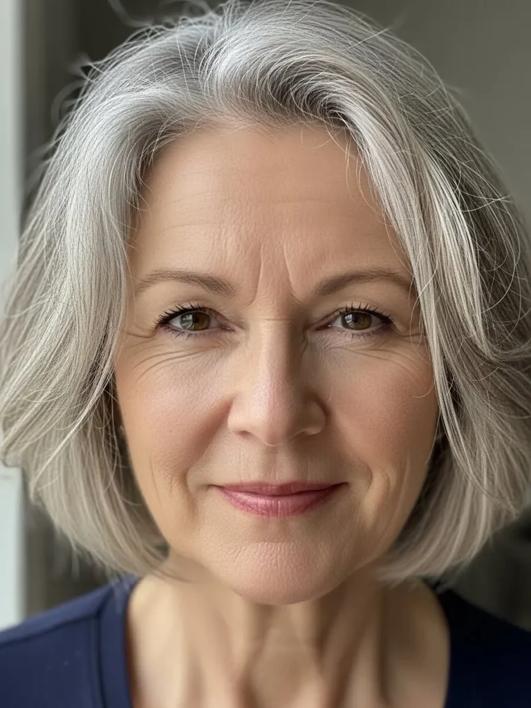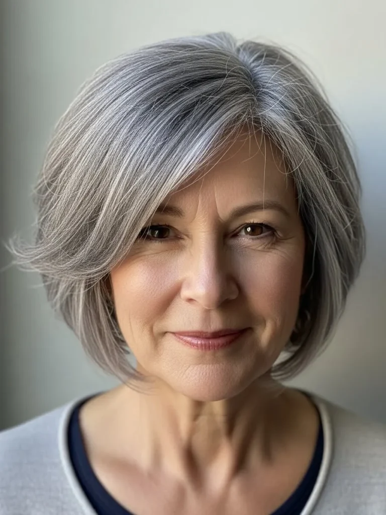 This sleek gray bob has a smooth finish with soft layers that curve gently toward the jawline. The side part adds a little sweep that brightens the face and the texture keeps the style light and airy. The color blends natural silver and soft gray which gives it a lovely soft glow.