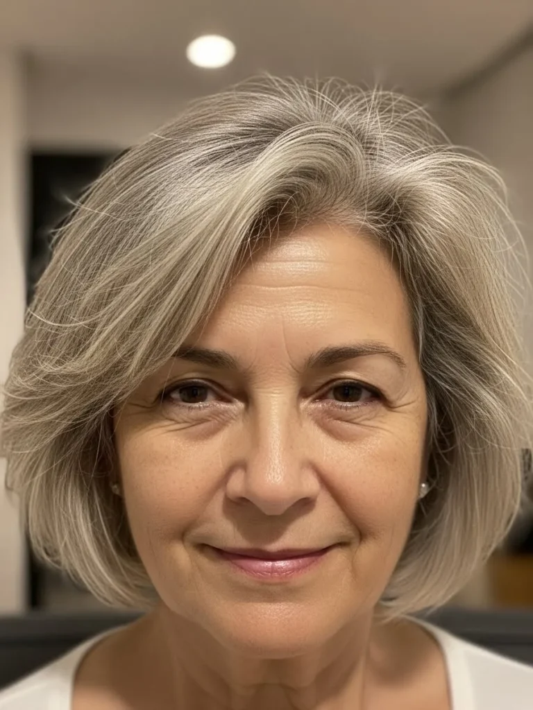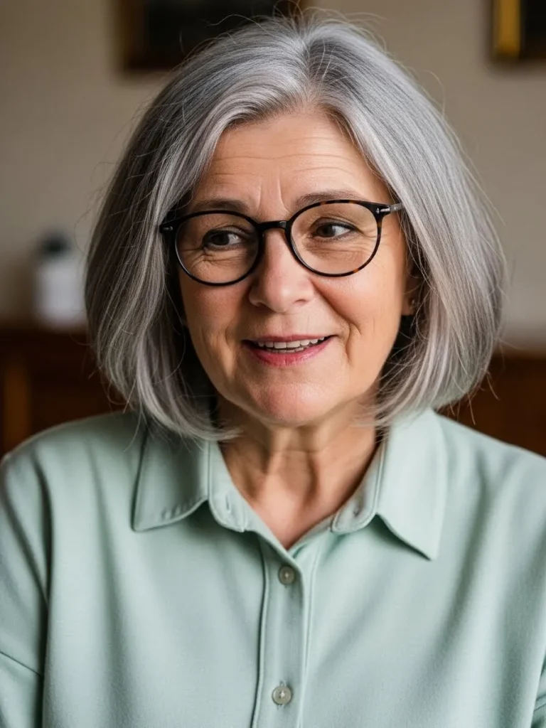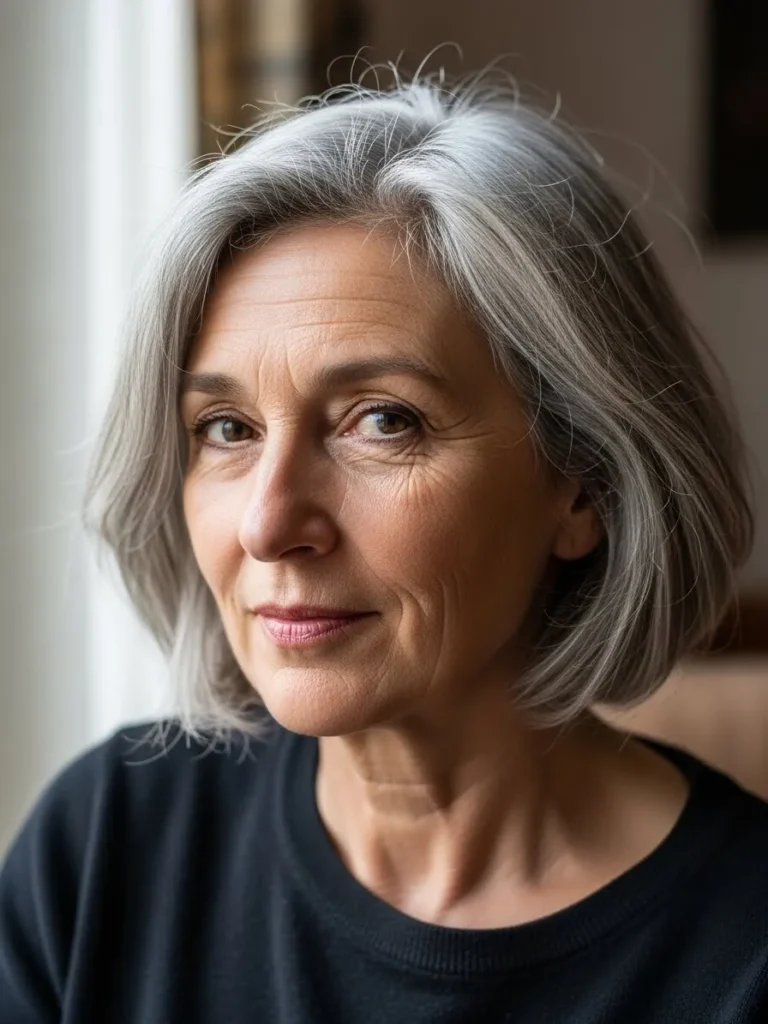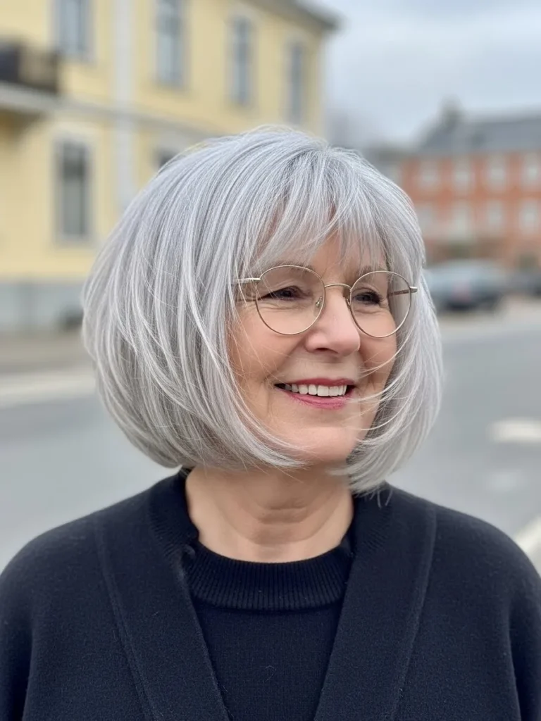 This sleek gray bob has a smooth finish with soft layers that curve gently toward the jawline. The side part adds a little sweep that brightens the face and the texture keeps the style light and airy. The color blends natural silver and soft gray which gives it a lovely soft glow.