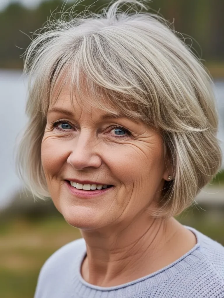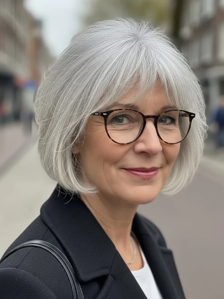 This bob features layered silver strands that fall in a natural soft shape around the face. The texture is gentle and the length sits just below the jaw for a balanced look. The light feathering gives it airy movement and the side part adds a calm relaxed sweep.