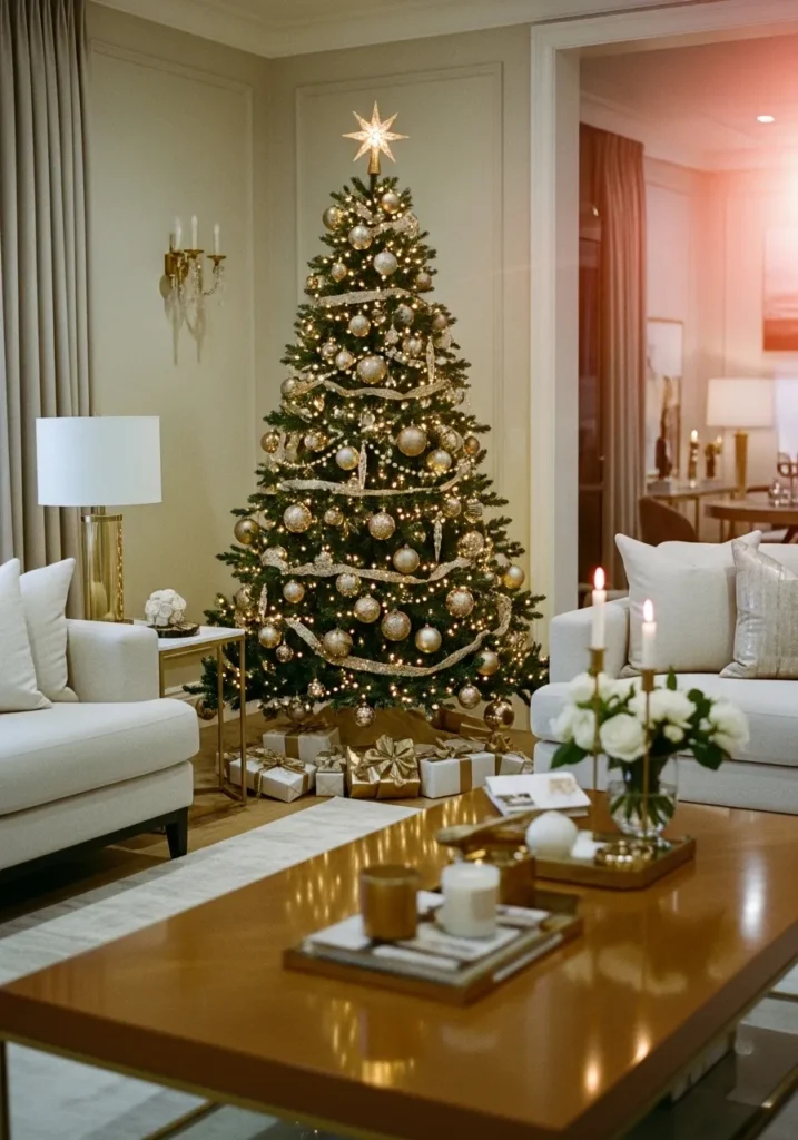 This living room feels like a warm holiday evening wrapped in a touch of glamour. The Christmas tree takes center stage, dressed in golden ornaments, twinkling lights, and soft ribbons that shimmer gently under the glow of a star topper. Creamy white walls and plush seating make the gold accents pop, while neatly wrapped gifts in metallic paper sit perfectly beneath the tree. The whole space feels intentional yet effortless, blending modern sophistication with cozy Christmas cheer.