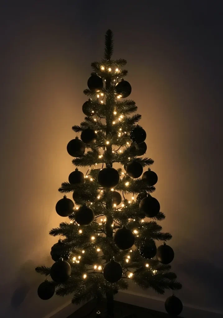 This Christmas tree captures a striking minimalist beauty with its deep black ornaments and warm white fairy lights. The dark matte baubles create a dramatic contrast against the gentle golden glow, making the whole setup feel effortlessly sophisticated. It’s simple, sleek, and surprisingly cozy, especially with the light softly reflecting off the wall to form a warm halo effect. The result is a tree that feels both mysterious and modern, perfect for anyone who loves understated elegance.