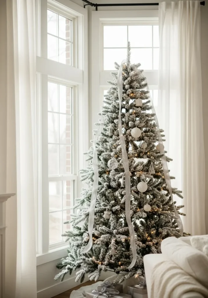 This Christmas setup is pure winter magic. The flocked tree looks like it was just dusted by fresh snow, standing tall beside big, bright windows that let in the softest natural light. The silver ribbons fall gracefully from the top like frozen waterfalls, and the white ornaments shimmer gently among the warm twinkle lights. The pale curtains and cozy cream sofa make the whole corner feel airy and peaceful, like a calm December morning.