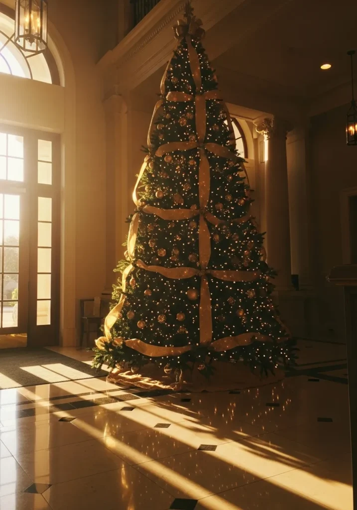 This elegant home design captures the kind of holiday magic that feels straight out of a classic Christmas movie. The towering tree, draped in shimmering gold ribbons and delicate twinkling lights, fills the grand foyer with a soft, golden glow. Sunlight streams through the tall arched windows, catching the ornaments just right, creating a dreamy sparkle that dances across the polished marble floor. The entire space feels warm, stately, and festive, all at once—a perfect mix of sophistication and seasonal joy.