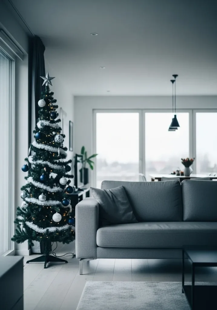 This living room captures that effortless Scandinavian charm where clean lines meet cozy calm. The Christmas tree stands tall beside a sleek gray sofa, dressed in simple silver and navy ornaments with a hint of soft twinkling lights. The minimalist palette of whites, grays, and muted blues gives the whole space a cool, elegant glow that feels both modern and welcoming. Natural light floods through the wide windows, keeping the atmosphere fresh and airy while the touches of greenery quietly nod to the season.