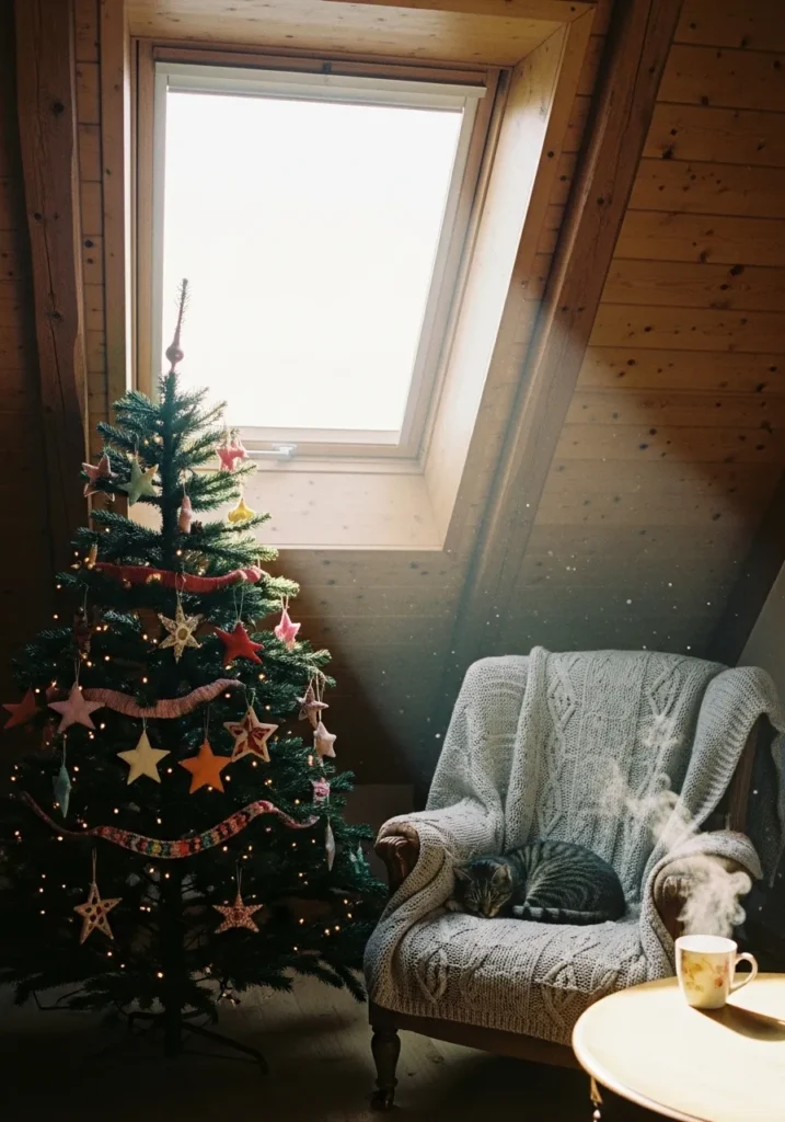 This snug little loft feels like something straight out of a winter dream. The slanted wooden ceiling, warm honey tones, and that big skylight letting in soft daylight create a cocoon of calm. The Christmas tree is charmingly simple, trimmed with handmade felt stars and garlands that look lovingly crafted. Beside it, a chunky knit blanket drapes over an armchair where a sleepy cat curls up, with a steaming mug nearby that practically whispers “stay awhile.”