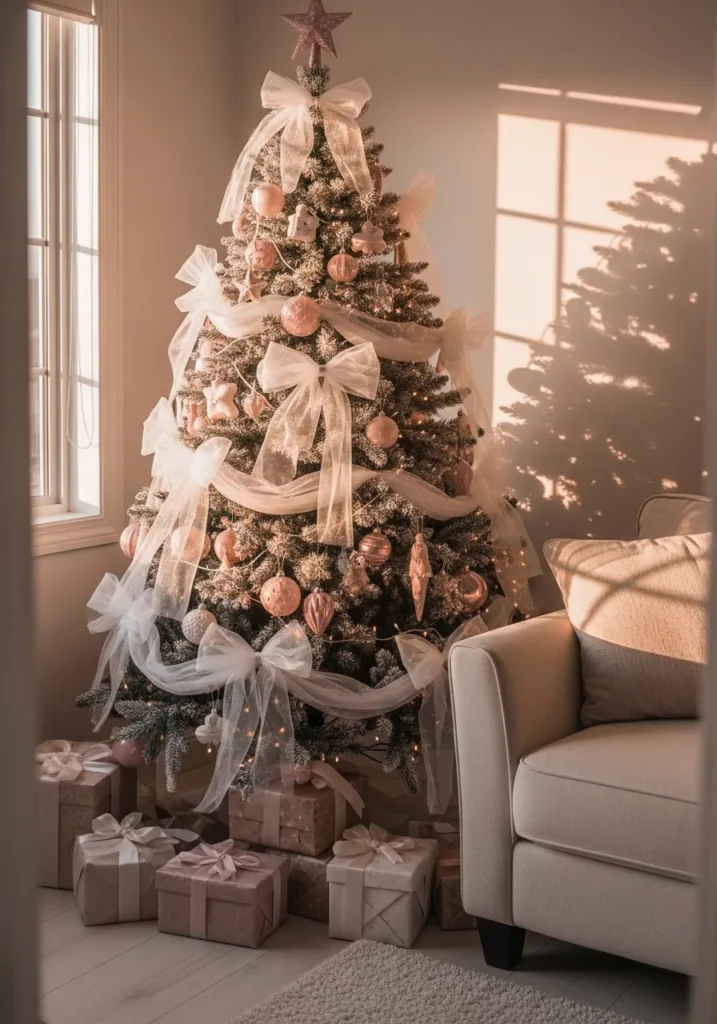 This dreamy living room feels like a soft whisper of winter elegance. The Christmas tree is dusted with gentle snow frosting and wrapped in sheer, billowy ribbons that catch the afternoon light perfectly. Pale pink ornaments and a sparkling blush star add a romantic, feminine touch, while neatly wrapped gifts in neutral and rose tones complete the picture. The sunlight streaming through the window creates a cozy, golden glow that makes every shimmer on the tree feel even more magical.