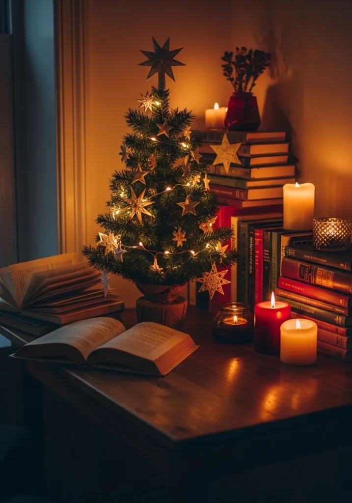 This corner feels like the kind of place where time slows down a little. The small Christmas tree, dressed in golden star ornaments and soft twinkle lights, sits beside a charming stack of well-loved books. A few candles flicker nearby, casting that perfect amber glow across the wooden desk and pages left open mid-story. Everything about this setup whispers warmth, calm, and the quiet joy of December nights spent wrapped in cozy layers with a good read.