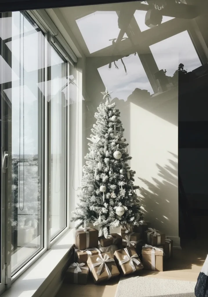 This design captures the calm beauty of a modern winter morning. The frosted Christmas tree stands gracefully by large glass windows, basking in natural light that makes every snowy branch sparkle. The ornaments are kept simple and elegant in shades of white and silver, giving the whole setup a fresh, airy feel. The neatly wrapped brown-paper gifts with white ribbons add a touch of rustic charm, perfectly balancing the minimalist aesthetic with cozy warmth.