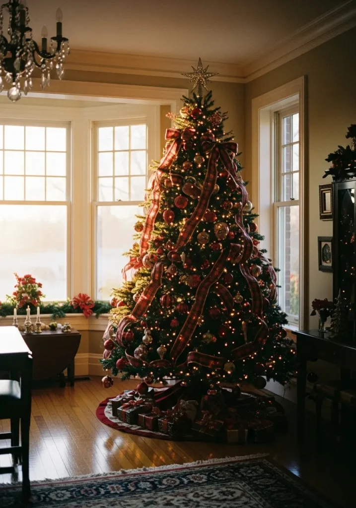 This gorgeous living room captures the timeless magic of Christmas with a tree that looks straight out of a holiday movie. Nestled perfectly in front of a sunlit bay window, the tall evergreen is wrapped in lush red plaid ribbons, gold ornaments, and sparkling string lights that make the whole room glow. The warm wood floors, elegant chandelier, and traditional rug add a cozy yet refined touch, while beautifully wrapped gifts sit neatly beneath the branches, waiting to be opened.