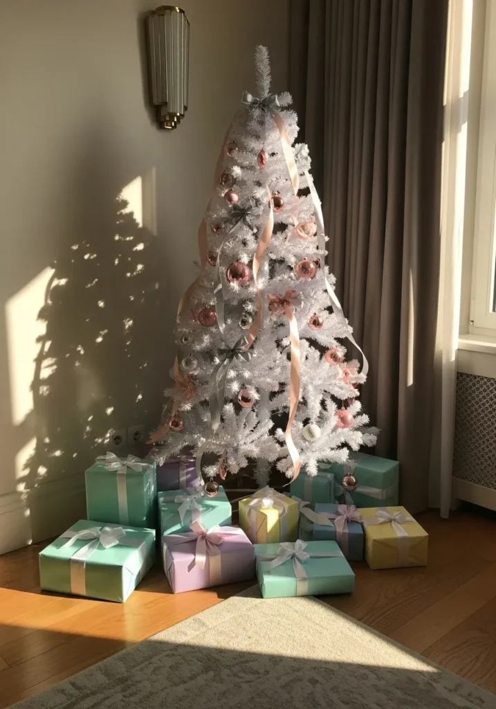 I absolutely love how peaceful this setup feels. It’s not your typical red-and-green Christmas scene, yet it still radiates holiday warmth. The pastel palette makes everything look so fresh and modern, and the light bouncing off those wrapped presents adds a subtle sparkle that feels joyful but still chic. I’d happily sit here with a cup of cocoa, just admiring how effortlessly elegant it all looks.
