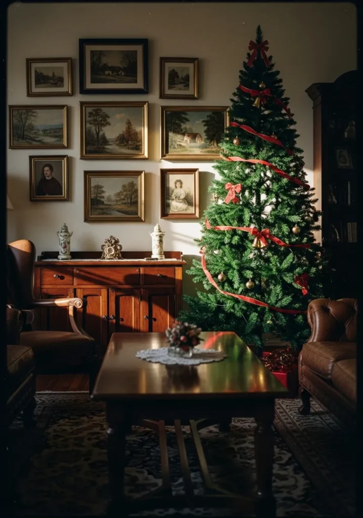 This lovely space feels like stepping into a classic Christmas postcard. The room features a tall evergreen tree trimmed with simple red ribbons and gold ornaments that shimmer softly in the afternoon light. Framed vintage paintings line the wall, adding to the old-world charm, while rich wooden furniture and tufted leather chairs give the space that cozy, timeless warmth. The lace doilies, antique vases, and soft patterned rug make everything feel homey and well-loved, the kind of place where stories and laughter are shared year after year.