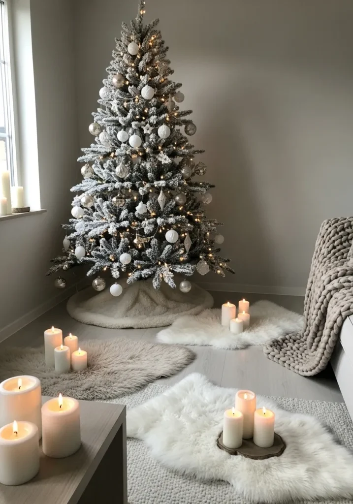 This room is the perfect example of calm, wintry elegance. The Christmas tree is flocked with soft snow-like branches, sprinkled with white and champagne ornaments that shimmer subtly under the glow of fairy lights. The base of the tree blends seamlessly into the room’s creamy tones, surrounded by fluffy faux fur rugs and clusters of glowing candles that give everything a warm, inviting radiance. The chunky knit throw draped over the sofa adds the final cozy touch, balancing the crisp winter whites with a hint of texture and warmth.