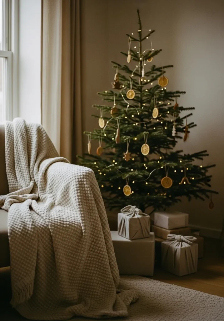 I absolutely love how peaceful this setup feels. There’s something so effortlessly beautiful about a Christmas tree that celebrates nature and craftsmanship instead of glitter and glitz. I can almost smell the pine and citrus while imagining myself curled up under that textured blanket with a cup of cocoa. It’s proof that sometimes the simplest touches make the most magical memories.