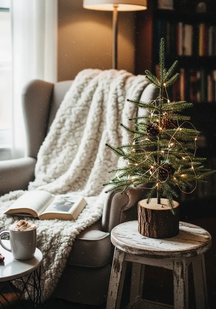 This little corner looks like the definition of comfort. A soft armchair draped with a chunky knit blanket sits by a window, perfectly lit by a warm floor lamp. A rustic wooden stool holds a petite Christmas tree, decorated simply with fairy lights and tiny pinecones. There’s even a mug of hot chocolate and an open book waiting to be picked up again. It’s the kind of setup that makes you want to stay in your pajamas all day and pretend the rest of the world doesn’t exist.