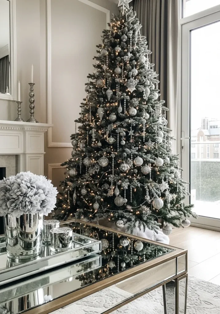 This living room feels like it’s dressed for a winter ball, with a tall, full Christmas tree shimmering in frosted silver ornaments, crystal icicles, and soft golden lights. The metallic touches are echoed throughout the space, from the mirrored coffee table to the silver vases and candlesticks on the mantel. Floor-to-ceiling curtains frame the view outside, while the neutral palette of soft grays and creams keeps everything calm, polished, and utterly sophisticated.