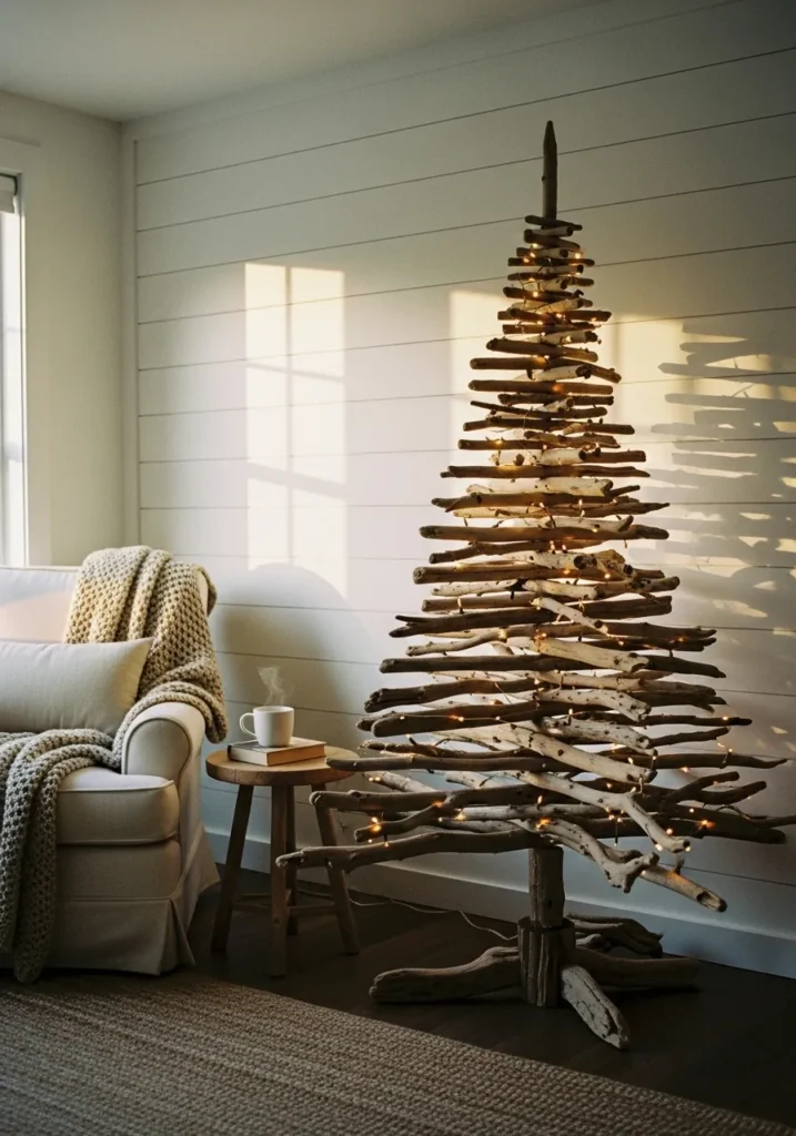 I love how this design proves that Christmas magic doesn’t need glitter or grandeur. The simplicity of natural wood paired with twinkling lights gives such a serene, organic vibe. It feels like something you’d find in a cozy coastal cabin where every detail whispers calm. I’d totally curl up here with a cup of hot cocoa and a good book while the lights on that driftwood tree twinkle gently in the background.