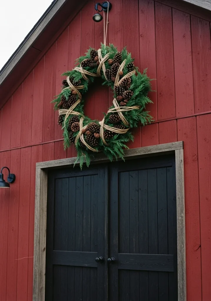 This rustic red barn front is bursting with natural charm. The oversized wreath of pinecones and evergreens is wrapped in twine, creating the perfect woodland-inspired look. The deep red siding and black barn doors make the greenery stand out even more, giving off major cozy countryside vibes.