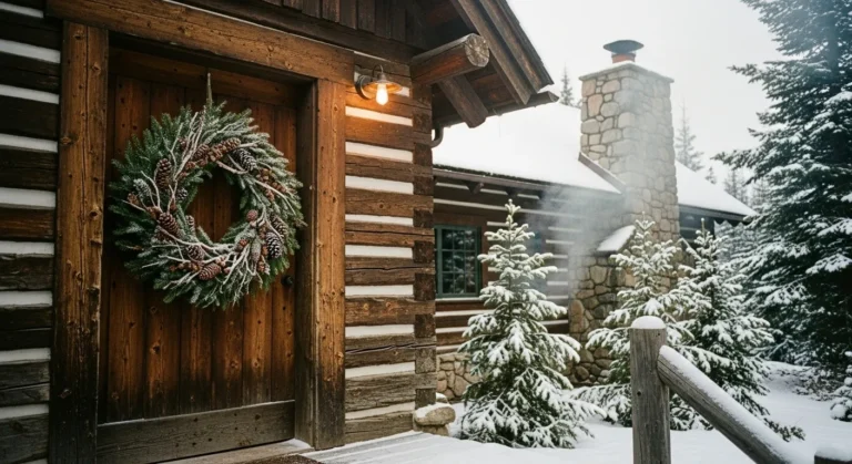 This rustic log cabin door looks straight out of a Christmas movie. The wreath of evergreens, pinecones, and intertwined twigs dusted with snow adds the perfect woodland touch. Paired with the weathered wood siding and amber glow from inside, it’s the definition of cozy mountain charm.