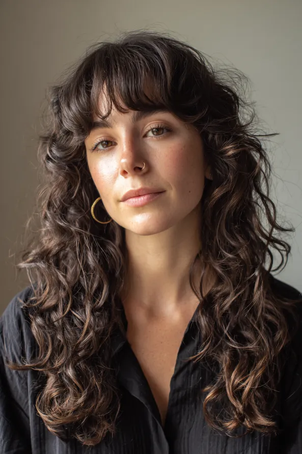 This long curly hairstyle features soft layers paired with light, wispy bangs that blend into loose, natural curls. The deep brunette shade adds richness, while the texture stays slightly tousled for a relaxed finish.
