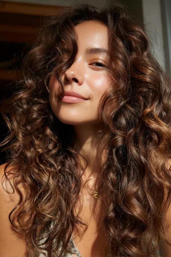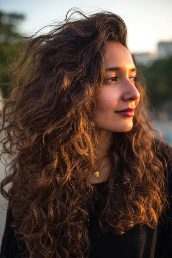 This look features long curly hair with soft volume and a natural, airy texture, highlighted by warm sunlight. The curls are loose and slightly fluffy, creating a romantic and effortless feel.