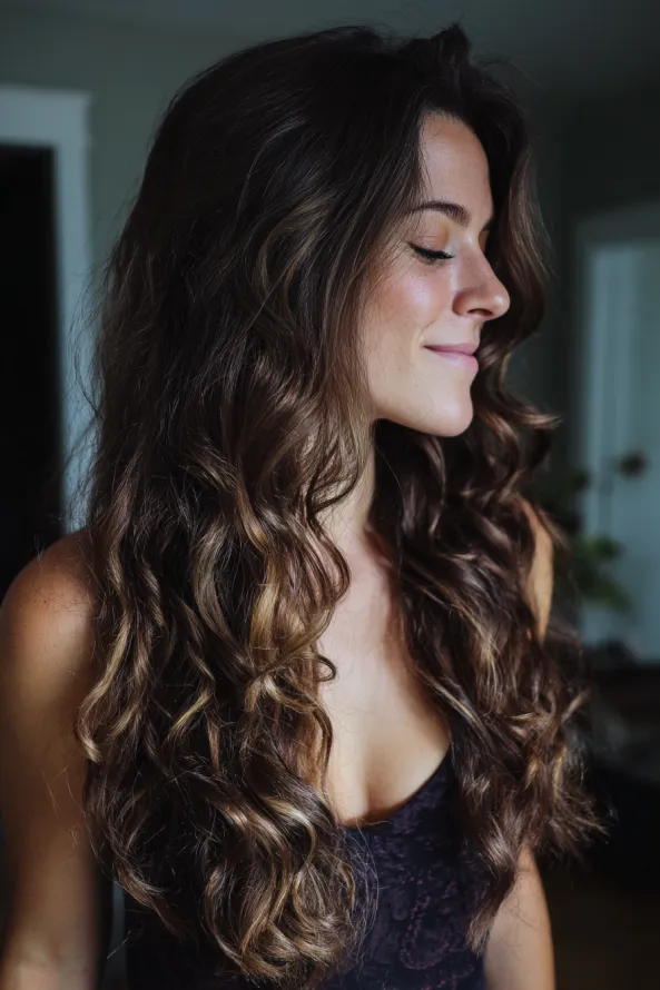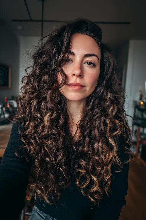 This look features long curls with a soft definition and hints of golden highlights throughout the ends. The curls are slightly loose, giving a natural and airy finish.