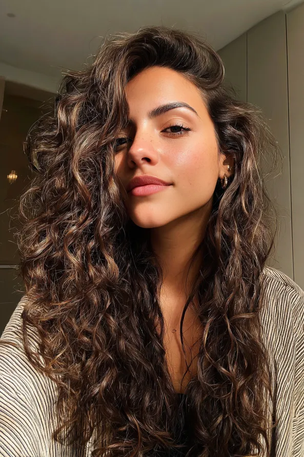 This long curly hairstyle features soft, defined curls in a rich brunette shade with warm caramel highlights placed around the face. The curls fall in loose spirals, creating natural movement and a sunlit glow.