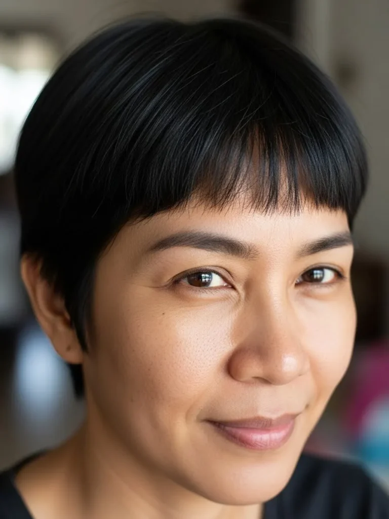 This short pixie feels clean and classic with its rich jet black color and soft baby fringe. The fringe sits lightly on the forehead and blends into smooth short layers that keep the shape neat. The texture stays sleek while still having a gentle softness that flatters the face.
