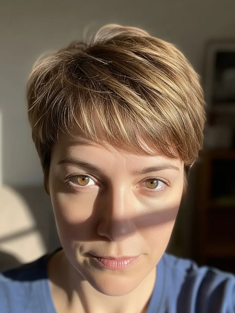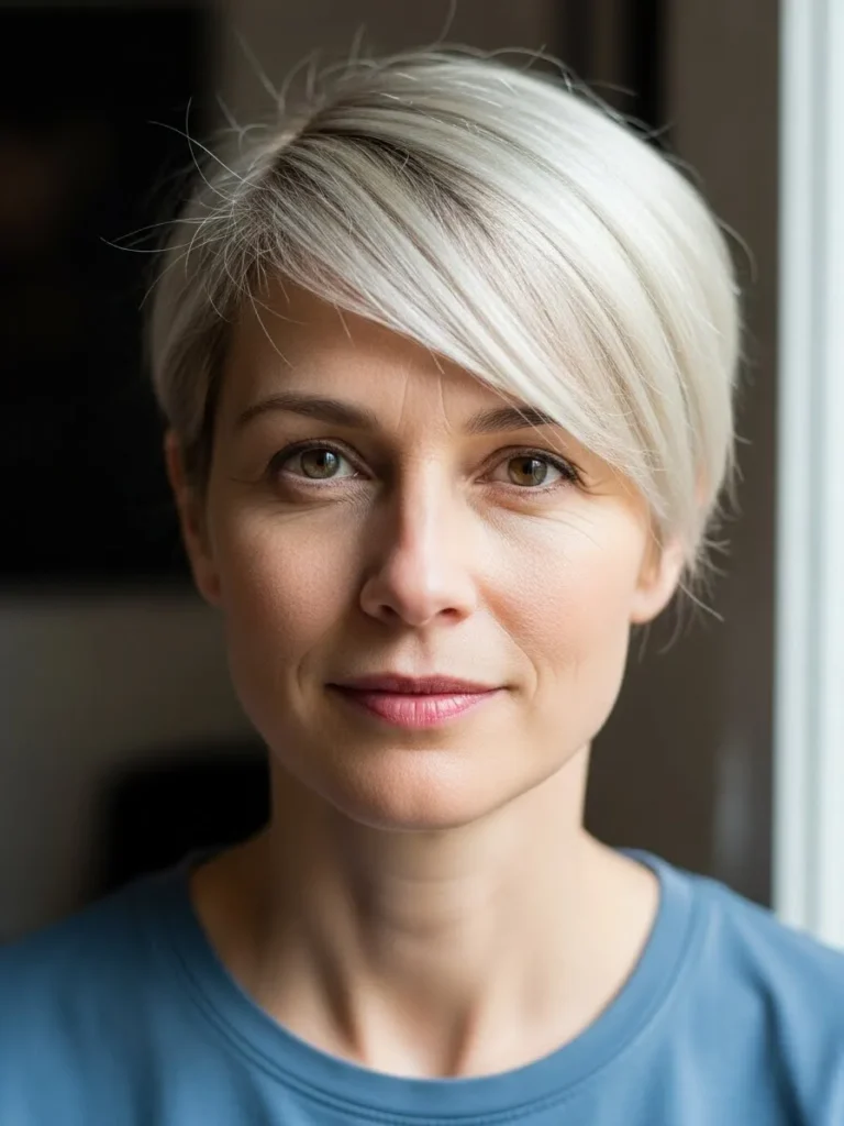 I love how flattering the side sweep feels. It highlights my cheekbones and gives the cut a graceful look that never feels too done. This is the kind of pixie that works for mornings when I want something simple that still makes me feel confident.