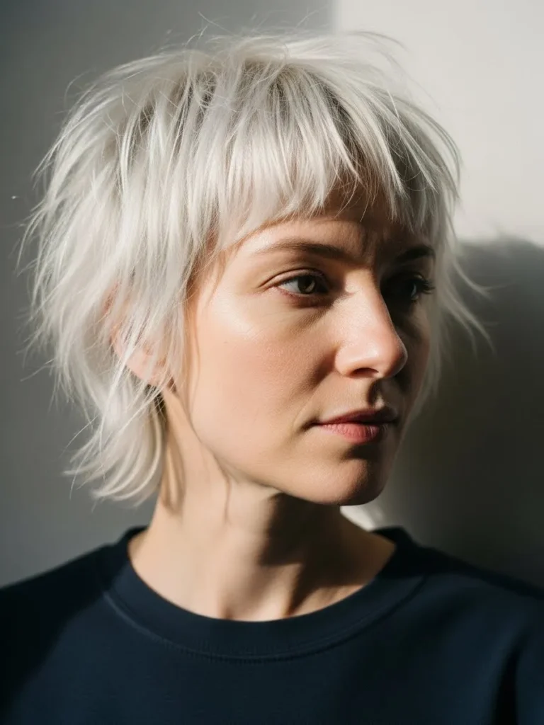This icy blonde pixie has a beautifully undone texture with soft choppy layers that create a feathered look. The baby fringe sits high on the forehead and blends into the rest of the cut which keeps everything airy. The white blonde shade brings a striking brightness that pairs so well with the messy tousled finish.