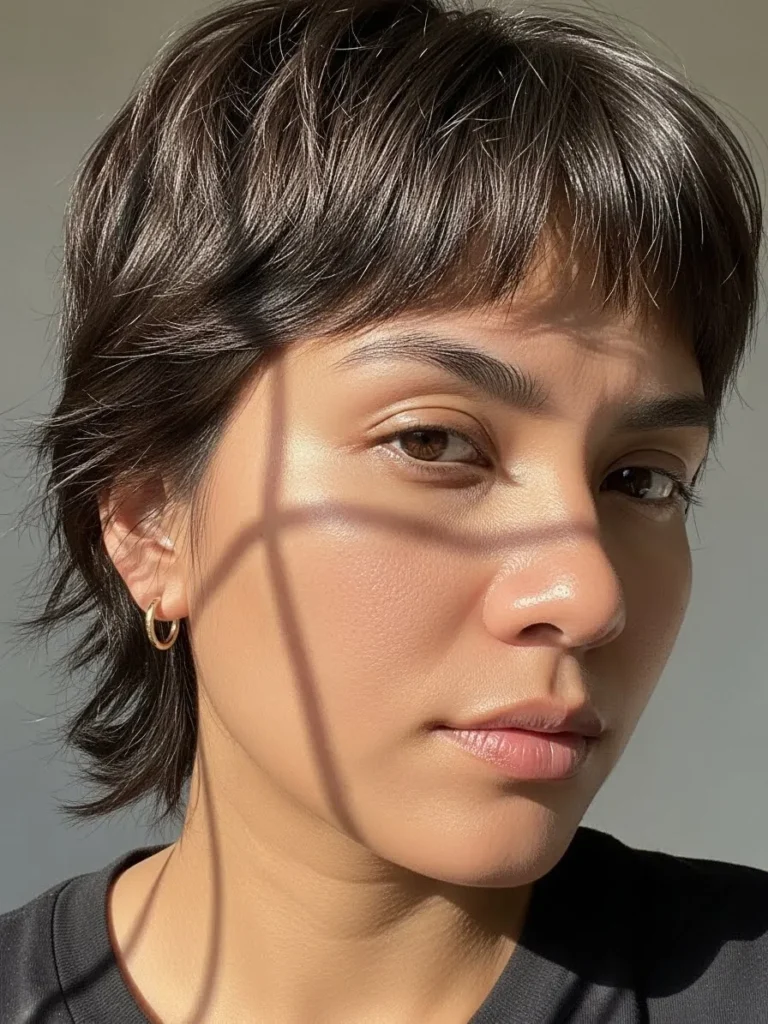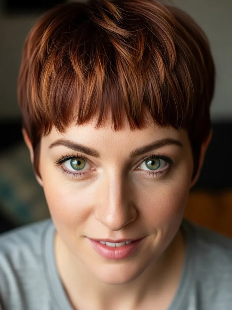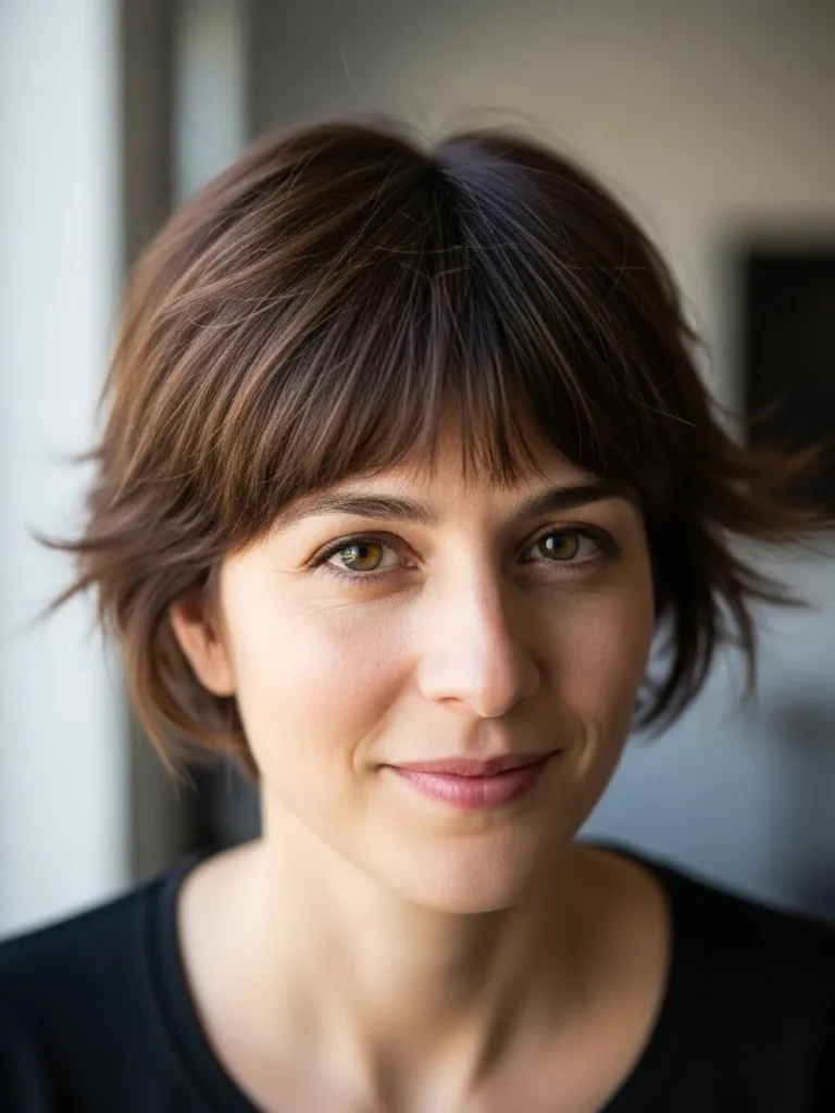 This pixie bob falls right at the chin and blends soft loose layers with a feathered fringe that frames the eyes. The warm brunette shade with subtle highlights adds dimension to the texture and the tousled ends give everything a relaxed lived in feel. The fringe is light and airy which keeps the look open and flattering.