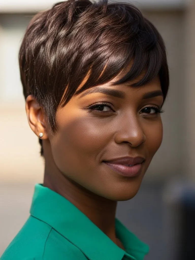 I always feel extra confident with a sweeping fringe like this because it has a way of lifting my features. It softens my expression while still looking sharp and intentional. It is the kind of pixie that makes me feel elegant even on the most casual days.