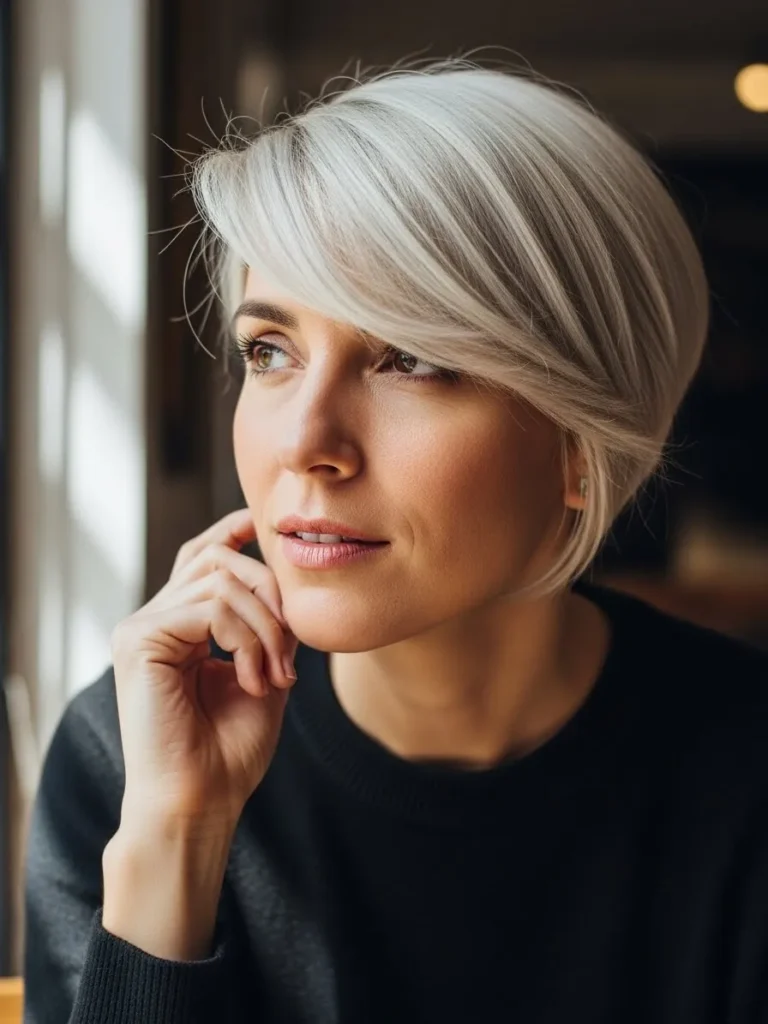 This sleek pixie features smooth layers that skim the cheeks and a long sweeping fringe that adds soft movement across the face. The silver blonde color makes the whole look feel bright and polished. The shape stays close to the head which gives it a fresh modern profile.
