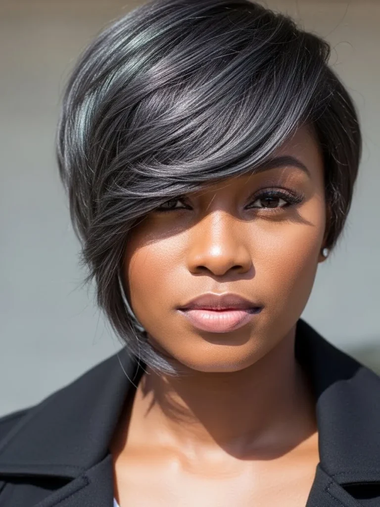 Deep Charcoal Pixie With Dramatic Side Fringe