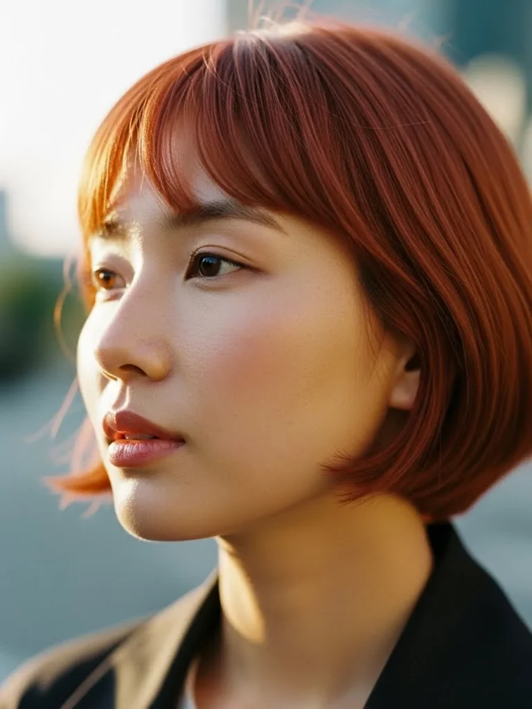 This haircut sits right between a pixie and a bob with a clean outline and silky layers. The bright copper shade adds energy and the short baby fringe gives it a cute modern twist. The ends curve softly which keeps the whole look playful.