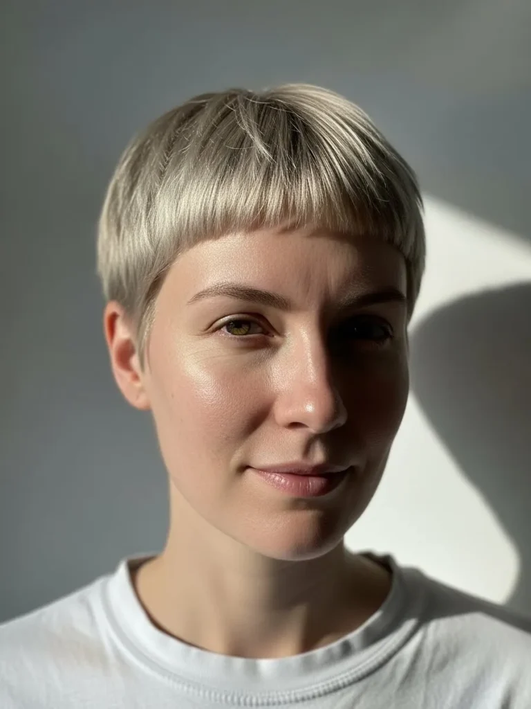 This sleek pixie features a short baby fringe that sits evenly across the forehead for a clean modern finish. The platinum shade brightens the entire look and the smooth texture keeps the style sharp and polished. The length stays close to the head but still has soft micro layers that add the slightest hint of movement.