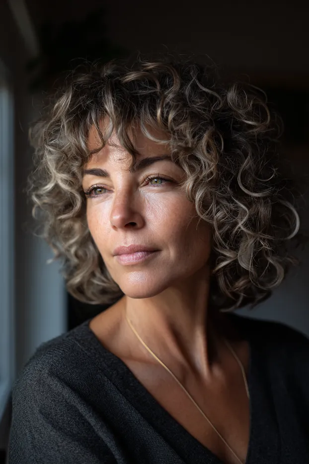 Salt And Pepper Curly Bob With Soft Fringe