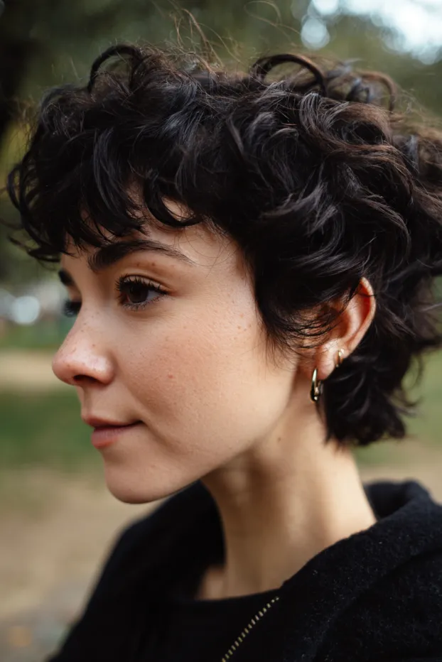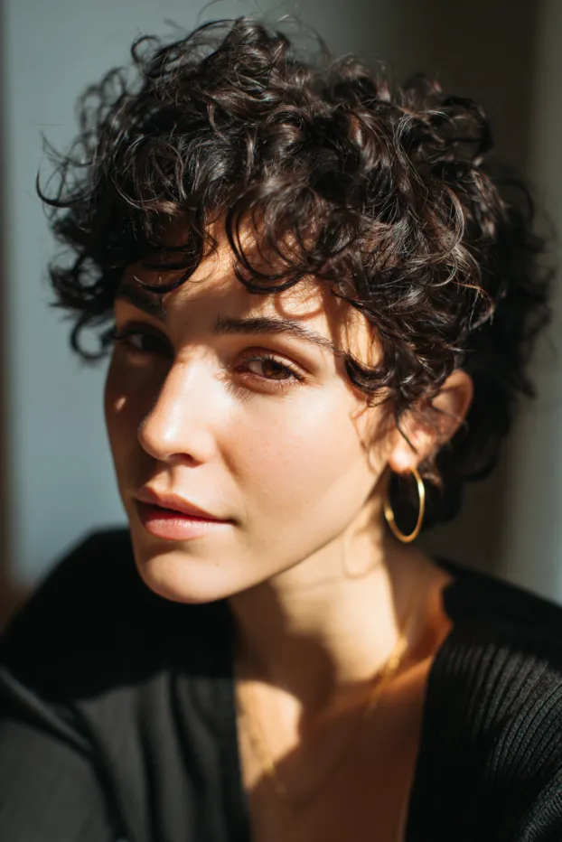 This cropped curly pixie features loose, tousled curls with a soft, textured fringe across the forehead. The dark brunette shade keeps it natural while the shorter length highlights the face and jawline.