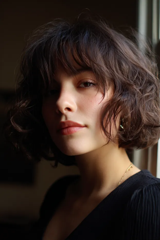 This hairstyle is a short layered bob with soft, loose curls and airy bangs that blend into the front. The warm brown color adds a cozy feel, while the layers create gentle volume without too much bulk.