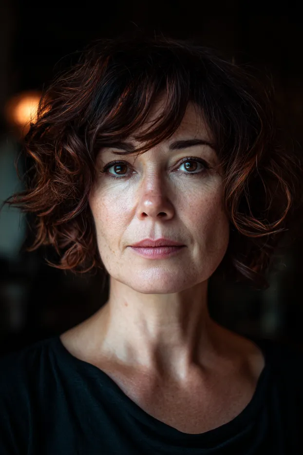 This style is a chin length curly bob with relaxed, airy curls and delicate wispy bangs that softly frame the eyes. The deep brown color adds a smooth, understated finish that keeps the look timeless.
