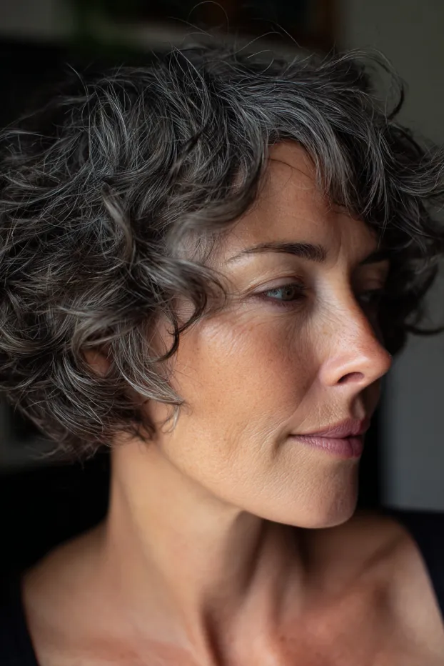 This look features a short curly bob with natural gray and dark tones blended together and soft bangs that frame the face. The curls are defined yet gentle, creating a balanced and elegant shape.