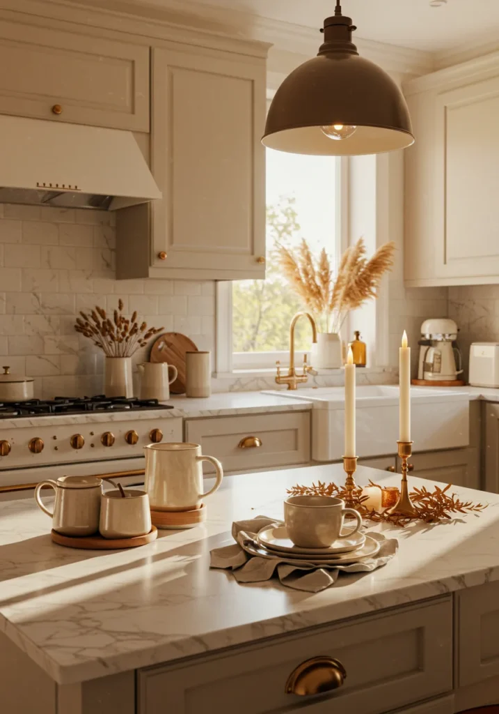 This kitchen glows with understated charm. Cream cabinetry, golden hardware, and marble counters set the stage for cozy Thanksgiving moments. A few neutral ceramics, soft candlelight, and dried pampas grass by the window pull everything together beautifully.